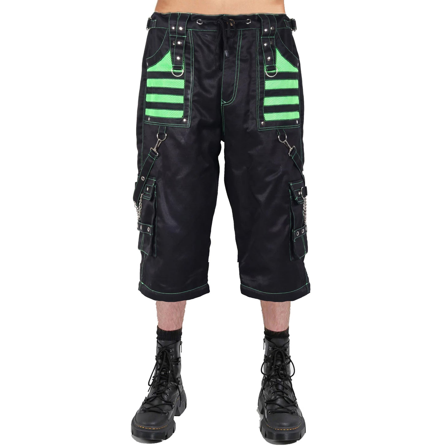 These are some of the coolest wide-leg made by shorts we've seen in quite some time. People who have trouble processing high levels of awesome should use caution while browsing this item! Unisex black cotton baggy Shorts with a striking neon yellow & black striped net over layer to the front & back pockets, removable bondage straps with chain attachments to each side with Velcro strap fastenings, neon lime contrast stitching throughout, with two cargo pockets featuring metal detail, plus adjustable waist and ankles with buckles and drawstrings, and zip-off feature below the knee to transform into long short.