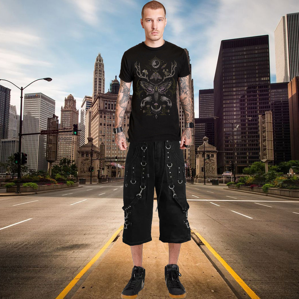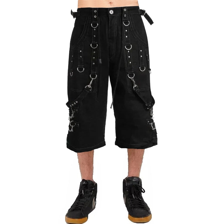 Men’s Grey Thread Cyber Punk Shorts Metal Studded Fashion shorts with Multiple Cargo Pockets, Detachable bondage straps with grey trim and stitching with Dentice ail stud, zips off into Shorts,100% Cotton, these are Elite Shorts are a pair of Classic Heavyweight baggy Shors. A Contrasting grey Thread runs through and have bondage straps and stud details. They can also zipped off in to shorts to allow you wear them even when the weather is warmer.