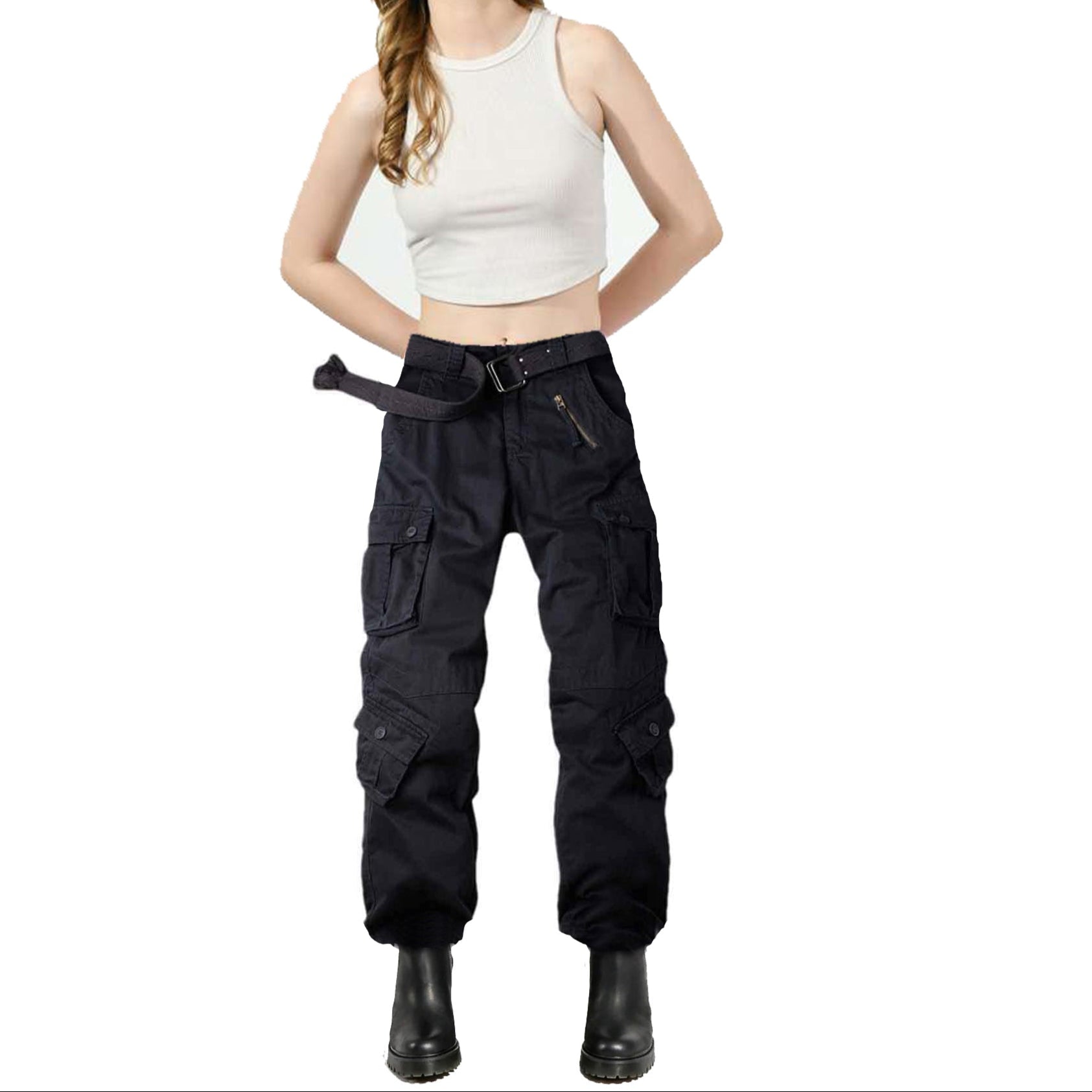 【Functionality】 : 2 back pockets, 2 slip pockets and 4 side pockets. Women's cargo trousers. The deep and practical pockets offer the trousers very enough storage space to store many things. Note: trousers do not include belts
